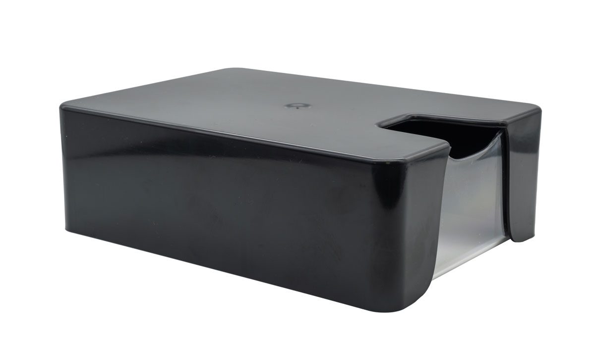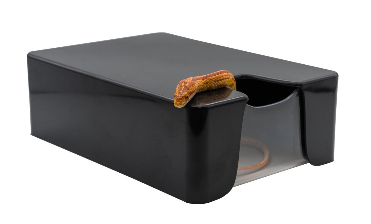The top section is manufactured using a smooth ABS black plastic, ensuring your snake feels safe in a dark environment, whilst the base section is manufactured using a clear plastic so you can view your snake from the front and underneath. The unique design means there is no traditional hole shaped in a lid, which means there’s no chance your pet could become stuck.